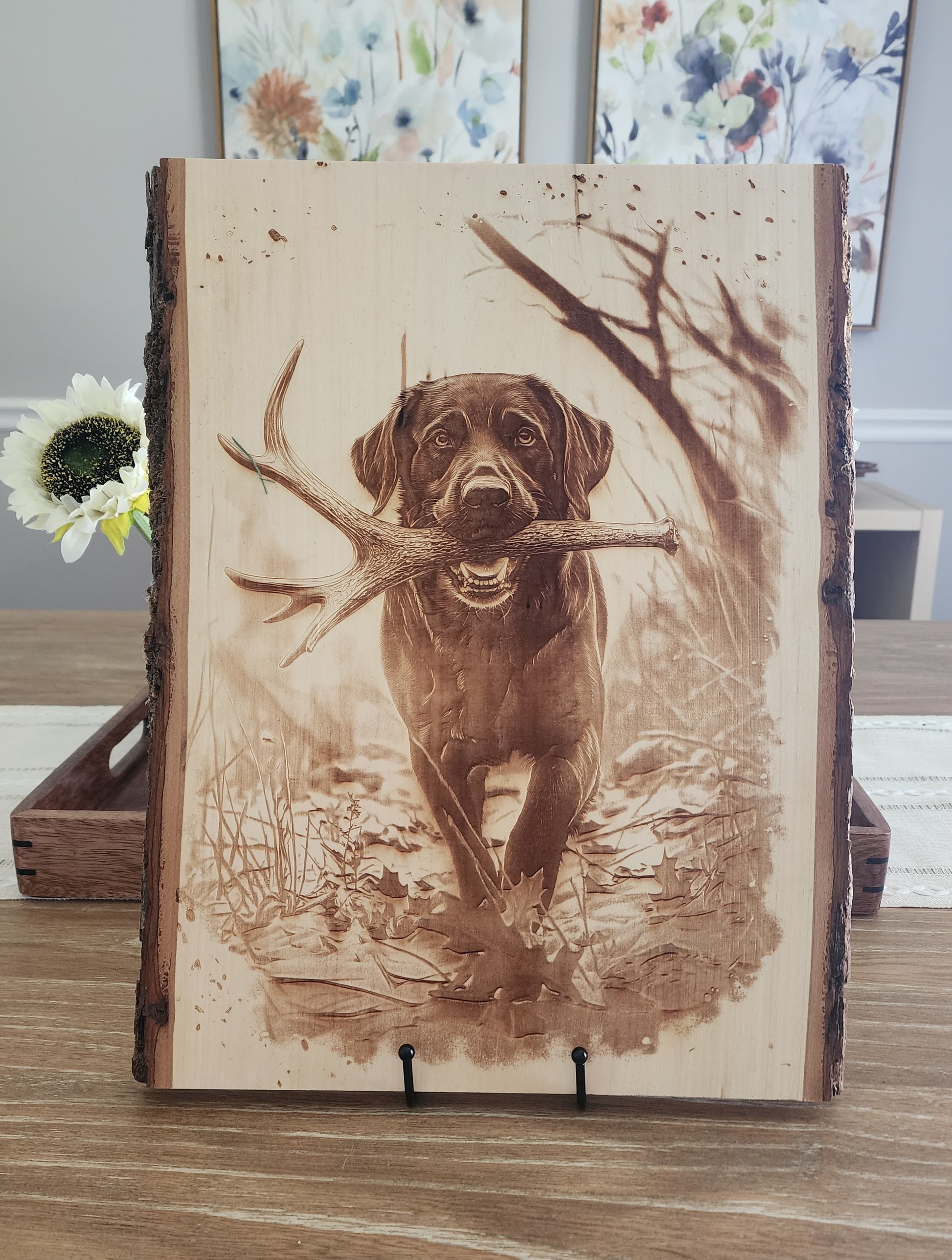 Crafted with precision, the engraving highlights fine details in the Lab’s expression, fur, and surroundings, while the natural live edge adds rustic character—making each piece truly unique.