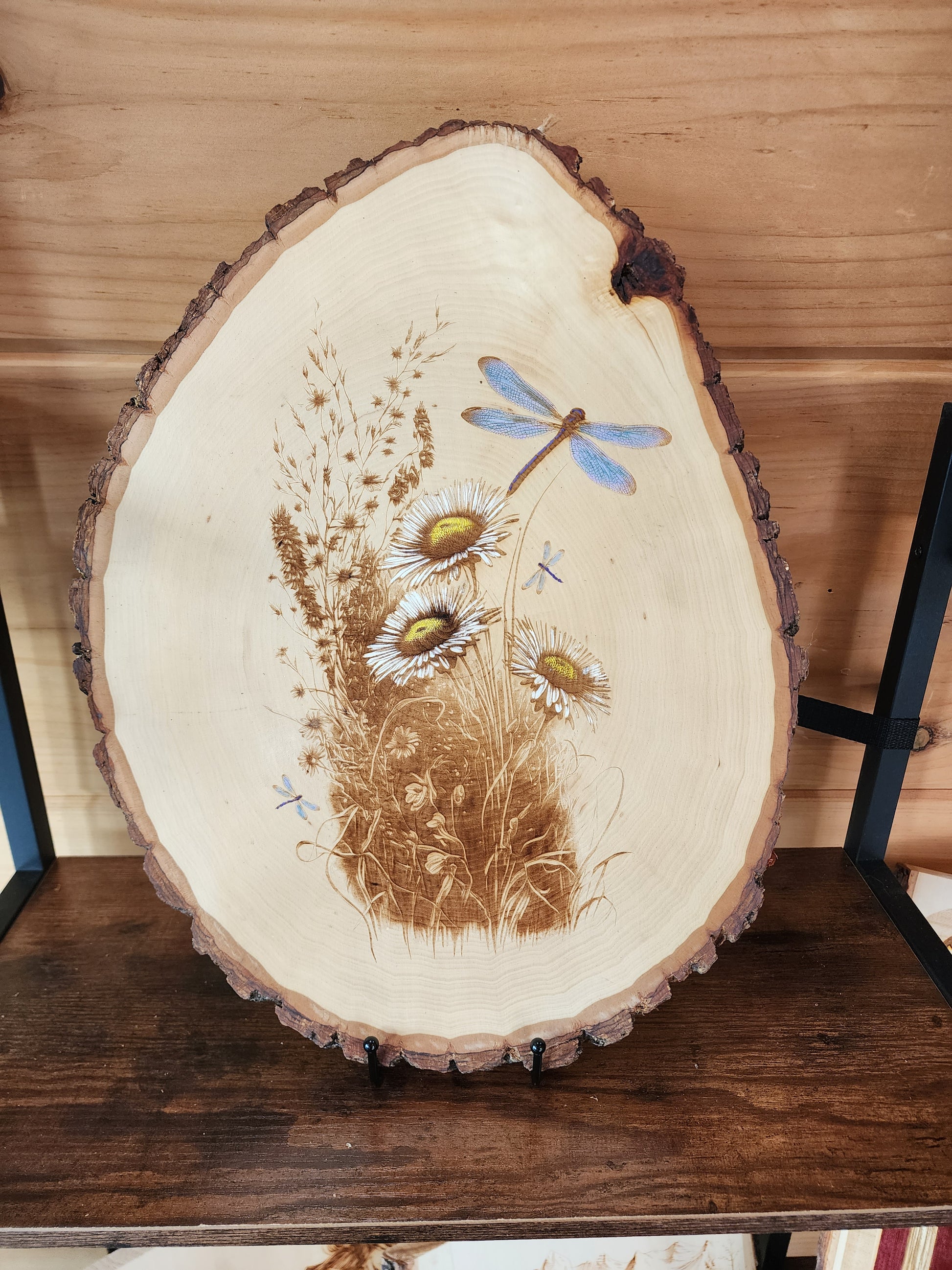 Dragonfly & Daisies – Hand-Colored Laser-Engraved Live Edge Wood Slice