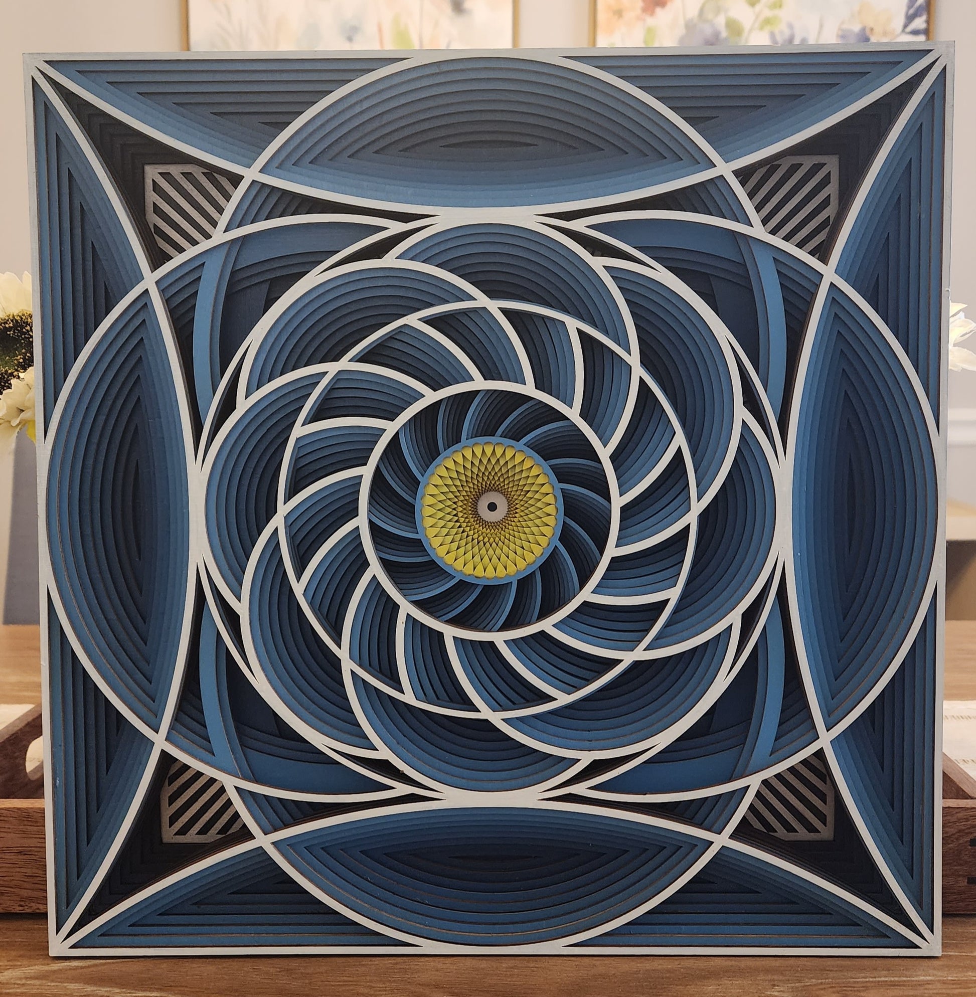 This Layered Geometric Mandala features a mesmerizing blend of deep blues, crisp whites, and a bold yellow center, creating a breathtaking focal point for any space. Crafted with multiple precision-cut layers, the design forms intricate arches, petals, and flowing curves that draw the eye inward with a sense of depth and motion.