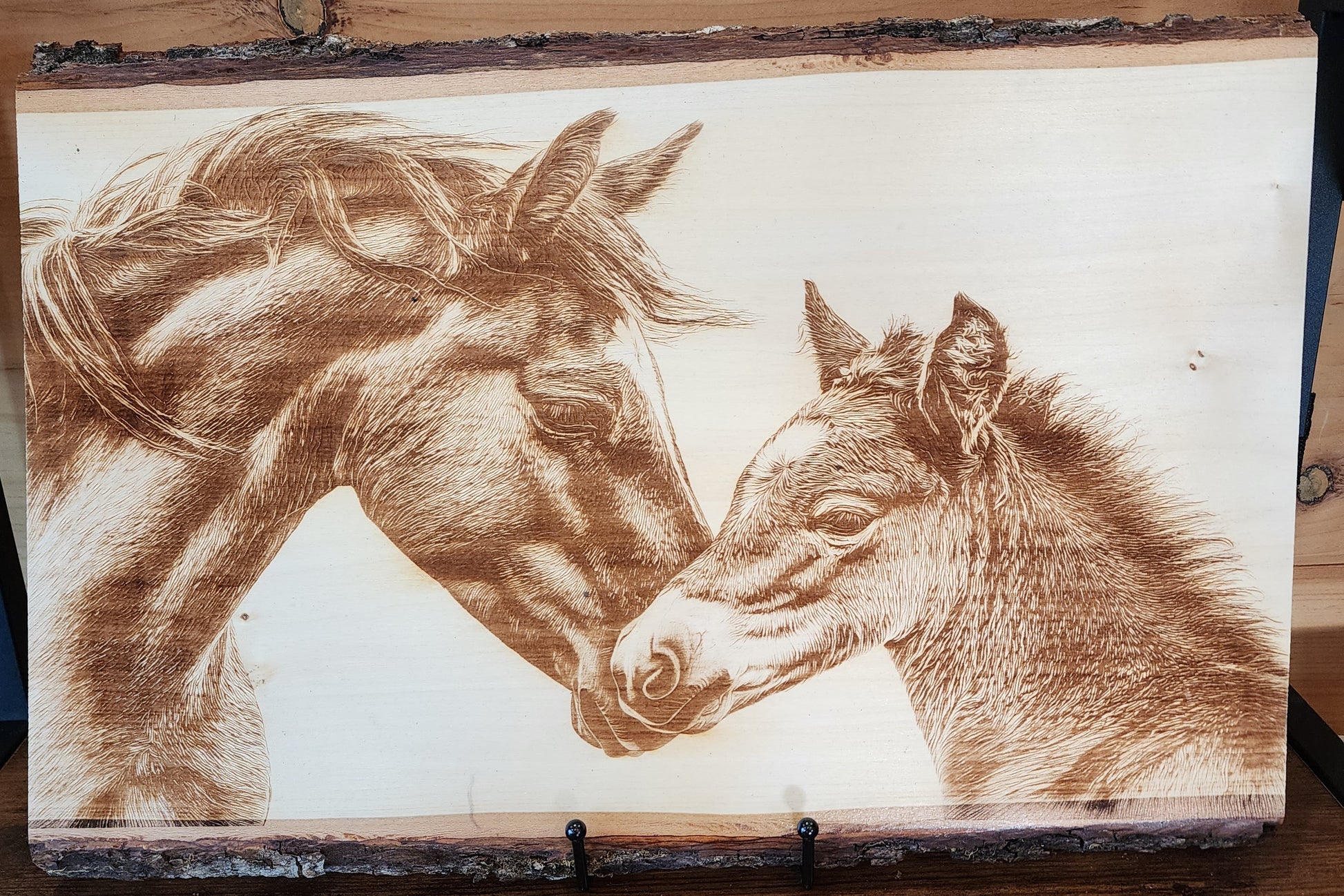 Mare & Foal – Laser-Engraved Live Edge Basswood Equine Art