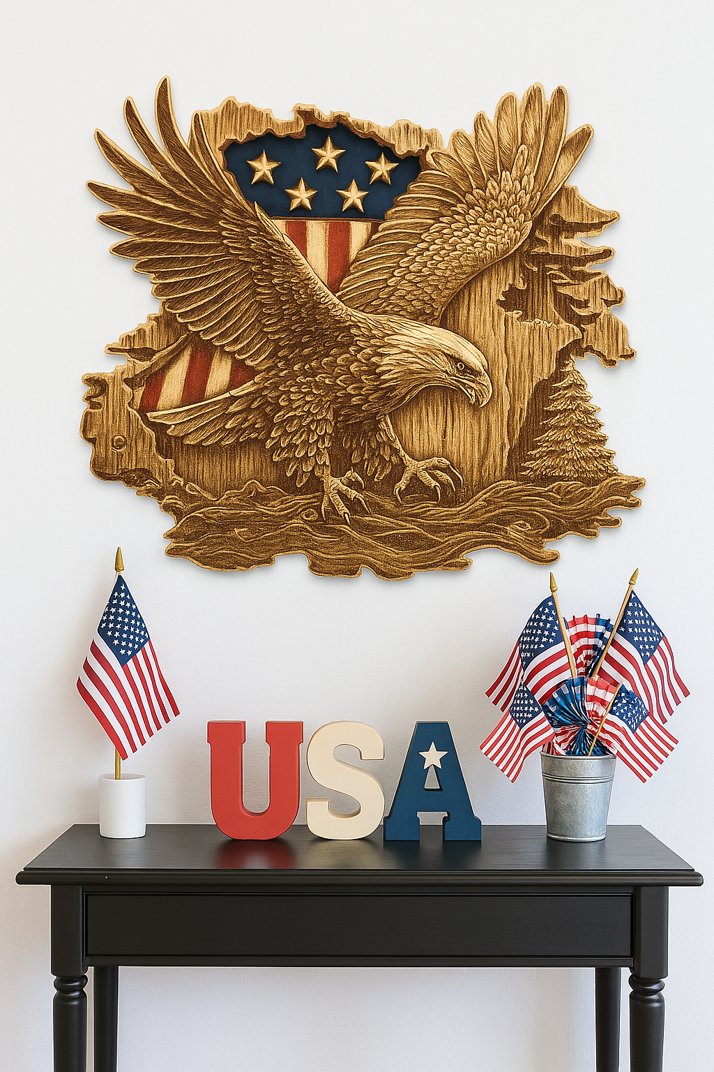 Patriotic Eagle Laser Engraving on Baltic Birch – American Flag Wall Art