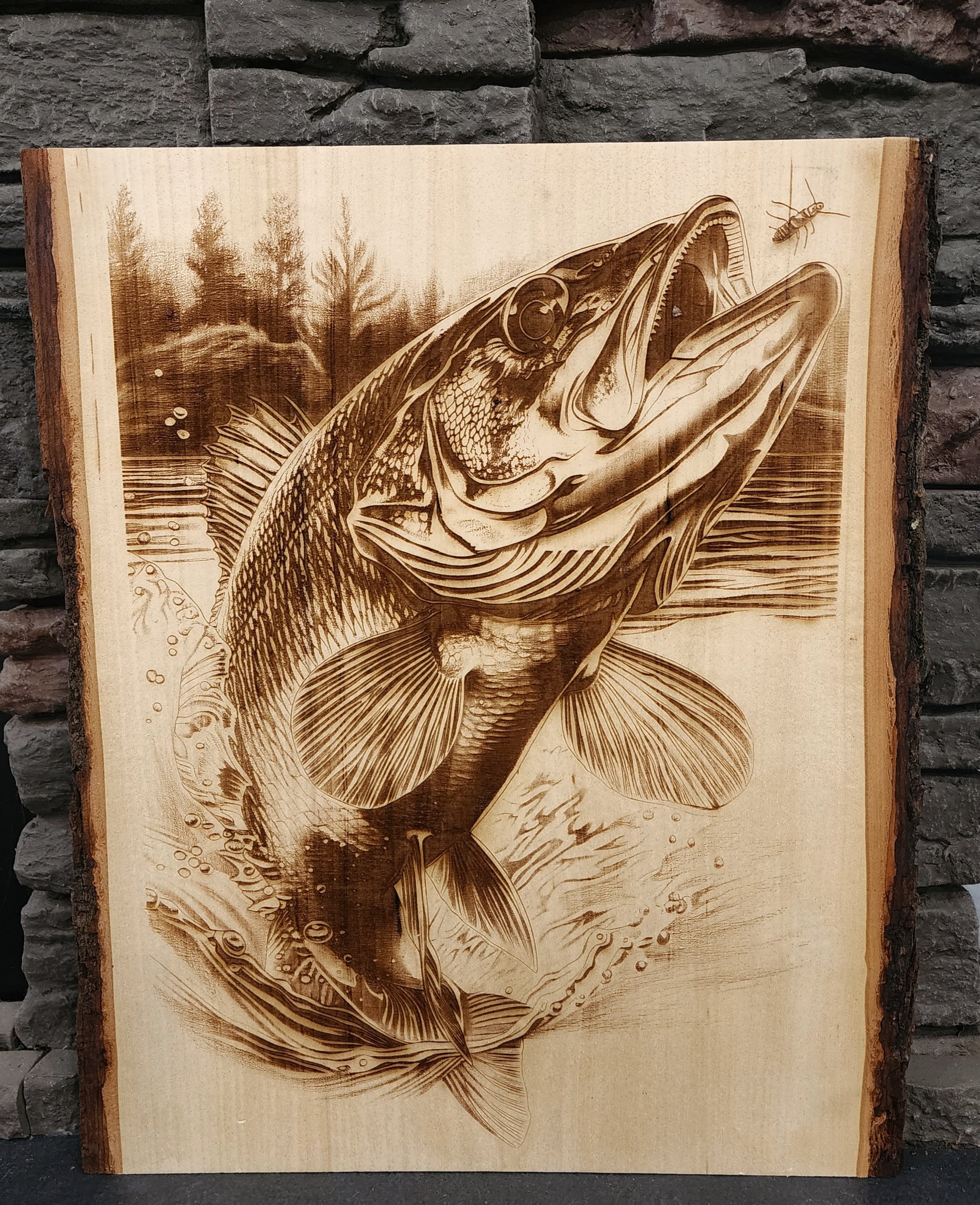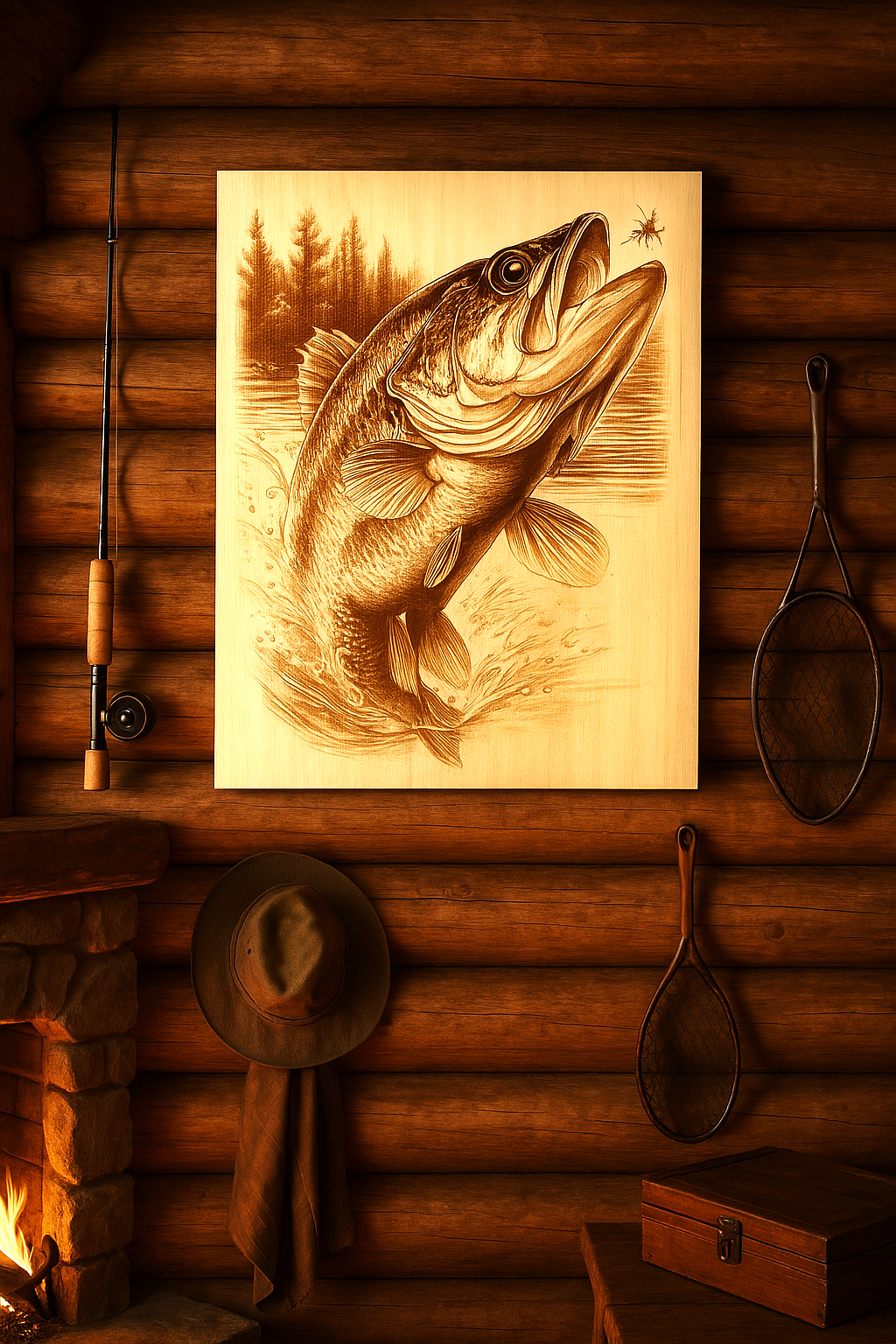 Celebrate your love for fishing and the great outdoors with this stunning laser-engraved bass on live edge wood. Featuring a majestic largemouth bass mid-leap, this piece captures the thrill of the catch in intricate detail. The natural edges of the wood bring rustic charm, making it a perfect fit for lake houses, man caves, cabins, or any nature-inspired decor. Whether you're an angler or simply admire outdoor wildlife, this artwork makes a thoughtful gift or a standout addition to your home.